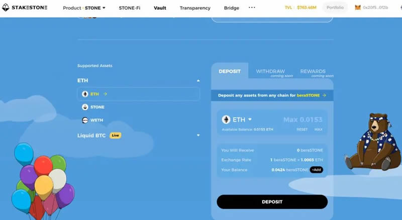 至stakestone 网页连结evm 钱包,将主网的$eth 存入,可以取得等值$berastone,主网gasfee 高建议最少存100 美元以上。