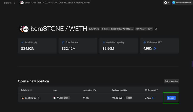 在morpho 借出的$weth 可以再回到步骤1 的stakestone 去质押,质押出来的$berastone 又能再借出$weth,如此可以进行2~3 次的循环贷。