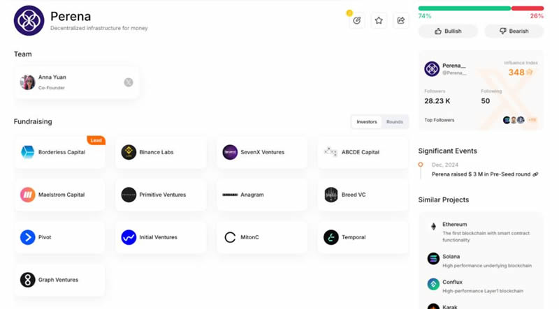 perena 在去年12 月pre-seed 轮获得了300 万美元融资,由borderless capital 和binance labs 等一线机构领投,重要的是perena 创始人为solana 基金会的稳定币负责人,也获得了solana co-founder anatoly yakovenko 和raj gokal 的支持,背景实力非常坚强!