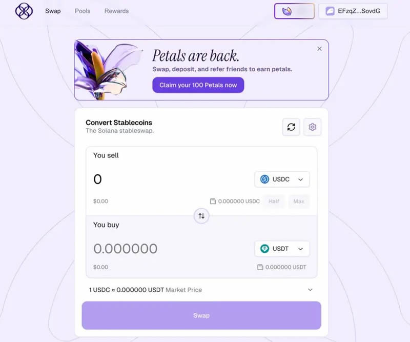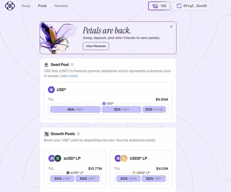 前往perena 网站,连结solana 钱包,okx、phantom 都可以,使用此连结加入邀请码可以获得100花瓣积分。