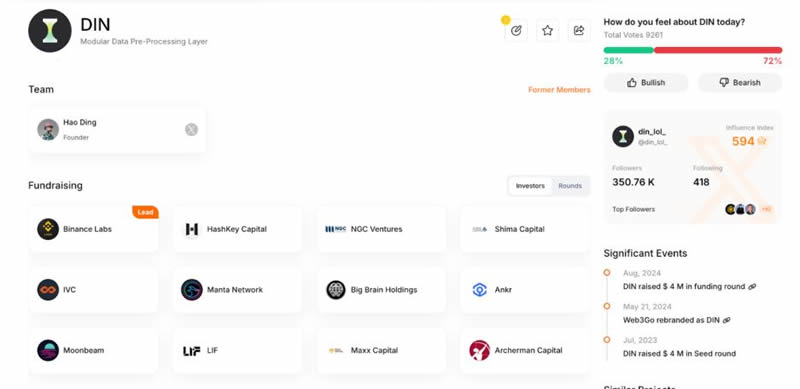 din 在去年种子轮融资400 万美元,当时币安就有参与投资,至今累积融资800 万美元,其中由hashkey、ngc ventures 领投,比近期上币安的grass、usual 融资都还高。