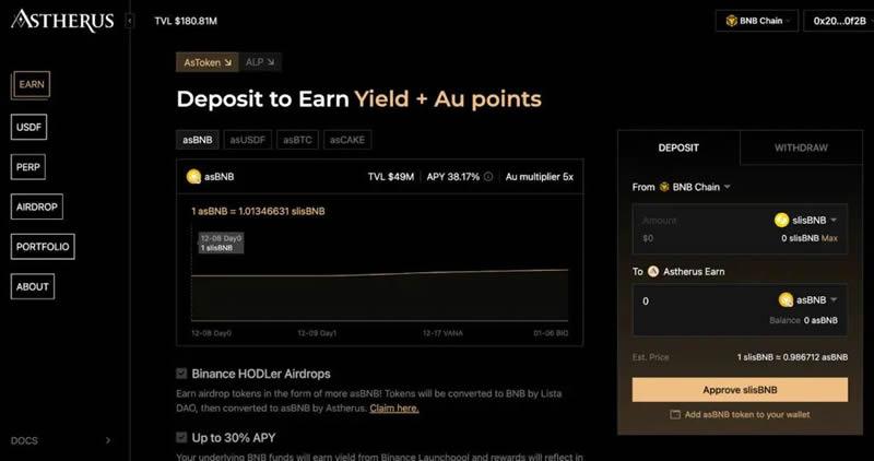 astherus 近期宣布和apx finance 合并,目前tvl 已达180m 并持续突破新高,项目尚属早期值得埋伏,笔者将在本篇说明astherus 更详细的交互方式、不同风险的积分获取方法。