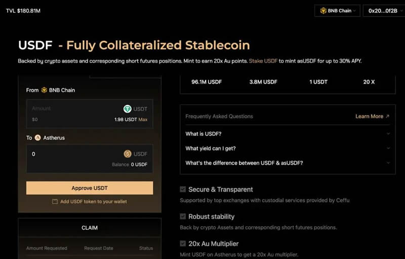 $usdf 是和美元挂勾的稳定币,可使用bsc 上的$usdt 铸造存入即可获得。此方式为目前最高积分的获取方式,积分倍率高达20 倍!需注意铸造后的存款暂时未开放赎回,建议不要存太大额度参与控制风险。
