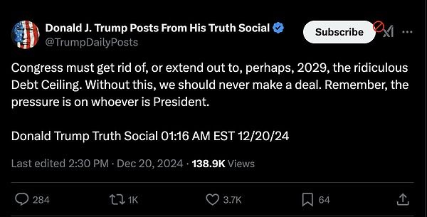 于公,特朗普心心念念的是取消联邦债务上限,以此支撑对外扩张和对内大规模减税;