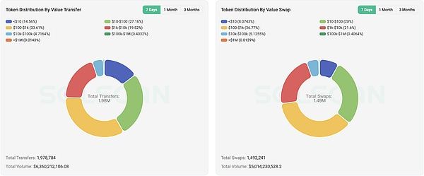 而在转账和交易数据上,10、100、1000 美元是最集中的人群,这是最标准的牛市散户画像,而在散户的激烈 pvp 中,已经迅速成为 200 亿市值代币,持币人数已经达 30 万。