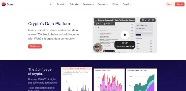 dune analytics 是一个强大的平台,用于以太坊和其他网络的链上数据分析,允许您创建自定义查询和可视化来研究交易量、与智能合约的交互和代币转移等指标。最新的实时数据、可视化工具和协作功能。该平台可用于分析市场、监控协议和研究区块链趋势。