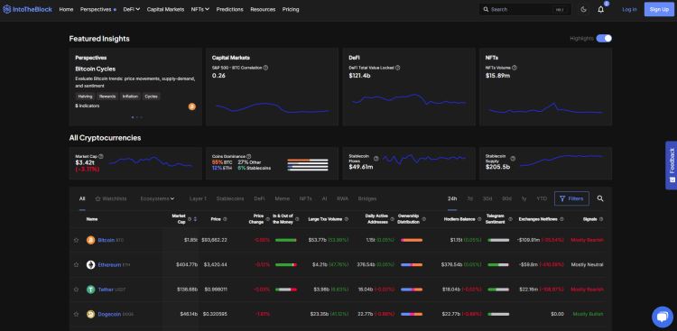 intotheblock 是另一个使用机器学习算法进行深入市场分析的加密货币分析平台。它提供了研究市场趋势、情绪和资产回报率的工具。支持对 900 多种加密货币的分析、人工智能驱动的价格预测、基于社交媒体数据的情绪评分、具有个性化见解的投资组合管理工具。