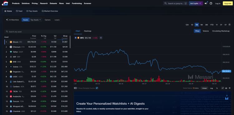 messari 是一家知名的加密市场分析服务公司,为区块链研究、研究和数据聚合提供工具。它允许您实时跟踪交易、地址活动和其他指标,创建单独的仪表板。它提供详细的报告、市场趋势分析、技术和竞争力评估,并从各种来源收集新闻。