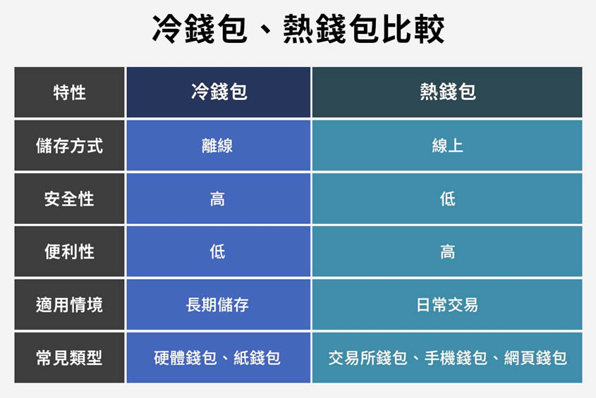 | 常见类型 | 硬体钱包、纸钱包 | 交易所钱包、手机钱包、网页钱包 |