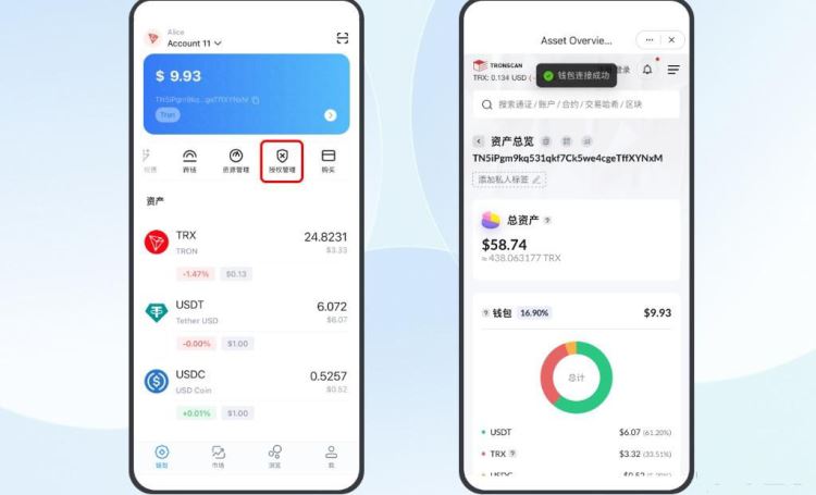 1、打开imtoken内的trx钱包,将首页的功能栏向左滑动,点击「授权管理」按钮,进入「tronscan」页面自动连接钱包,查询授权。tronsacn:可查询和处理trx钱包授权的工具。如果你无法打开此页面,请切换手机网络后再尝试打开。