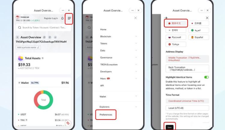 2、进入tronscan后如果页面是英文,可点击右上角菜单栏,再点击最下方「preferences」(即偏好设置)-「简体中文」-「save」(即保存)进行语言切换。