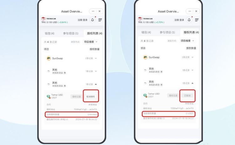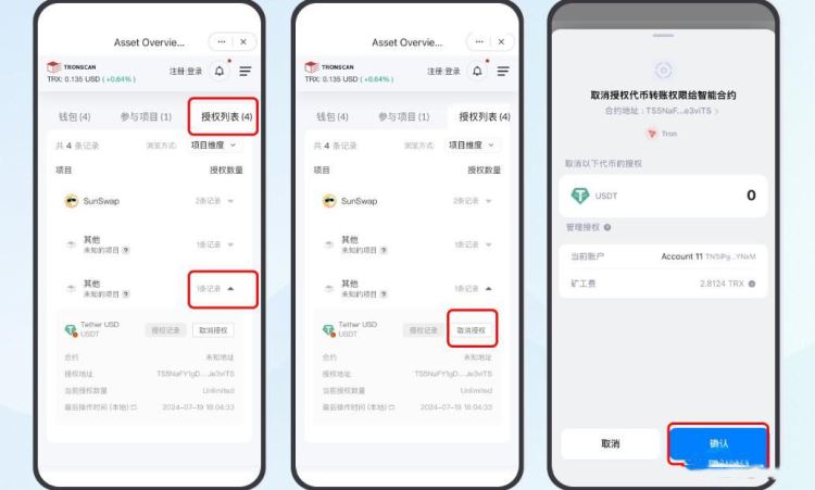 imtoken钱包被授权取消授权其操作还是比较简单的,代币授权骗 局主要发生在以太坊和波场上,下文是以trx钱包被授权取消的教程讲解: