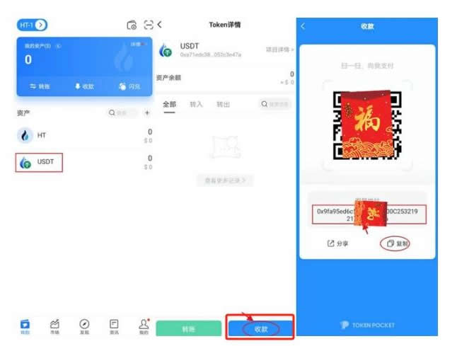3、获取usdt收款地址。这个是你tp钱包收款地址,别人往这个地址转币,你可以接收到。