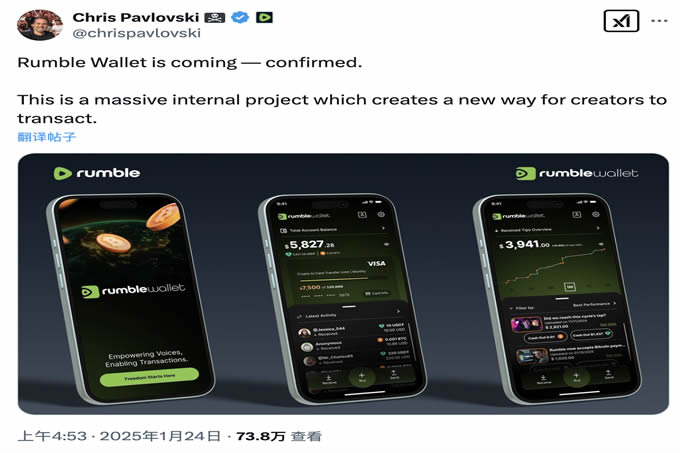 而在今年1月,rumble还宣布将推出支持比特币和usdt的加密钱包rumble wallet,将为创作者提供新的交易方式。创作者可通过这两种加密货币接收粉丝打赏和订阅收入。tether ceo paolo ardoino就此表示,“rumble wallet 一个很酷的功能是使用 ai 代理/助手来帮助管理付款、根据过去的活动建议比特币储蓄策略、向最受关注的创作者进行打赏等。”