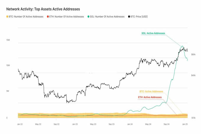 根据网络活动率趋势报告(network activity report)显示,solana区块链上散户的加密钱包地址的活跃热度已超越比特币和以太坊,此指标根据钱包在链上的活跃度、转帐交易量和交易费用做分析,这些指标的周期性上升可以视作为散户对于投资标的物的信心与热衷持续交易的黏着度,值得注意的是,solana区块链的表现甚至超越比特币,大量链上交易活动于今年初达到新高。