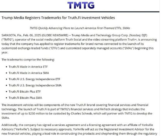 而在上任之后,特朗普家族除了在加密领域“大捞特捞”之外,特朗普家族也在涉入传统金融产业,2月6日,特朗普的社交媒体公司truth宣布,其已经为旗下定制化etf产品和单独管理账户产品注册了6个商标,具体的金融产品将在年内推出。从已经推出的几个商标的名字来看,特朗普媒体科技集团大概率会推出美国制造业、能源产业和比特币三个方向的主题产品。这些产品都将归于集团刚刚成立的金融服务品牌truth.fi。