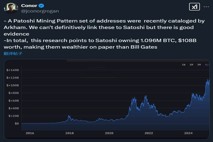 另外在调查中,conor引用arkham的数据指出,中本聪持有的比特币数量,大约可以确定为109.6万枚,价值约为1,080亿美元,按照这一数据,中本聪的个人财富,已经超越了微软创办人比尔盖茨的身价。