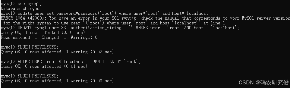 问题点:如果 flush privileges; 未执行,mysql 仍然会使用旧的用户认证规则,导致密码修改后仍然无法登录