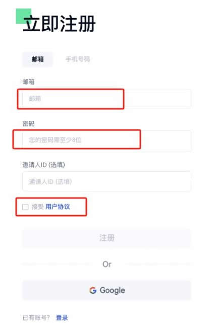 2、在注册页面,根据提示填写信息(邮箱、登录密码等),勾选“接受用户协议”,点击“注册”。