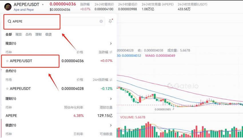 6、在进入也页面后,搜索apepe,选择apepe/usdt,就可以看到该币种的交易信息以及市场信息
