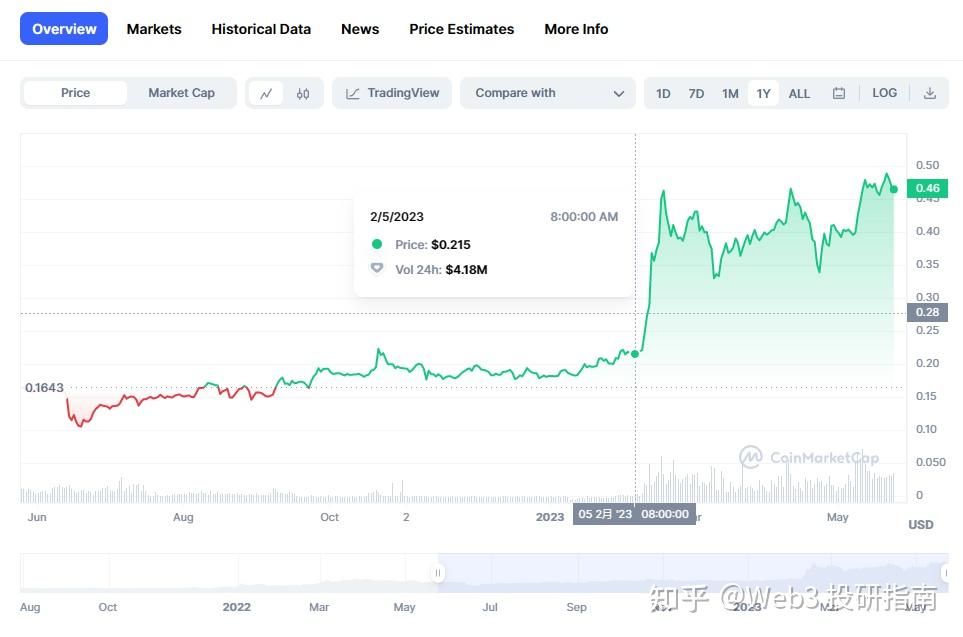 市场表现:2024 年表现出色,曾在 1 月 24 日至某时段内,交易价格从约 0.57 美元飙升至 1.43 美元,涨幅达 150%。2024 年 12 月 4 日起连续多日领跑涨幅榜,累计涨幅超 70%,价格突破至 2.8 美元,流通市值攀升至 39 亿美元。到 2024 年 12 月 26 日,市值首次突破 100 亿美元,年内增长超过 1100%,市值排名上升至第 19 位。