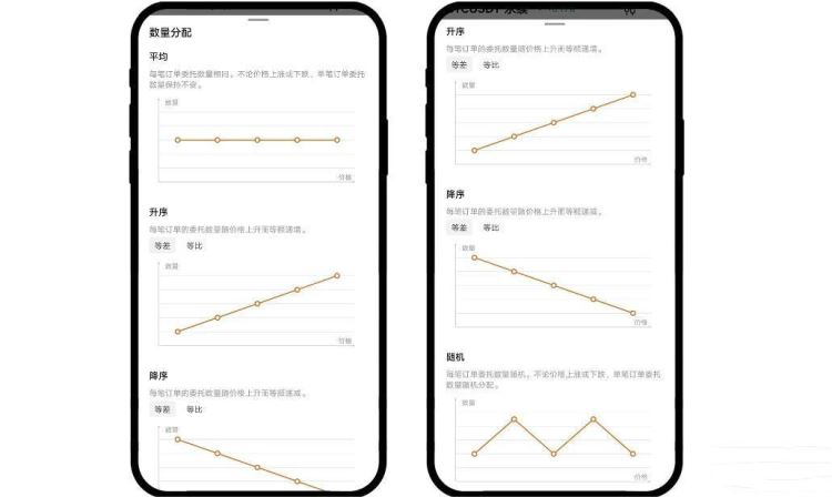 分段委托把大宗订单拆分成若干小订单,分散进出场,降低对盘口的冲击,减少大单造成的价格波动带来的交易风险分段委托设置了多种委托模式,如均分、升序、降序、随机,4种模式拆分订单,满足您的下单需求。自动下达多笔拆分后的订单,有利于快速成交,提高您的交易效率。