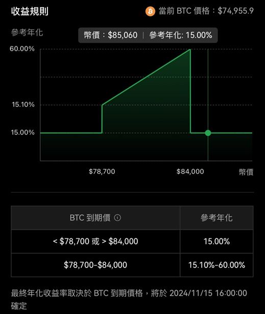 当价格在84,000 ~ 78,700之间时可以获得15.1%~60% usdt 收益,到期时的价格越接近84,000 收益越高,最高达12% 。