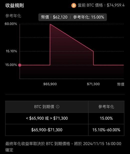 当价格在65,900 ~ 71,100 之间时,获得15.1~60% usdt 收益,到期时的价格越接近65,900 收益越高,最高达60% 。