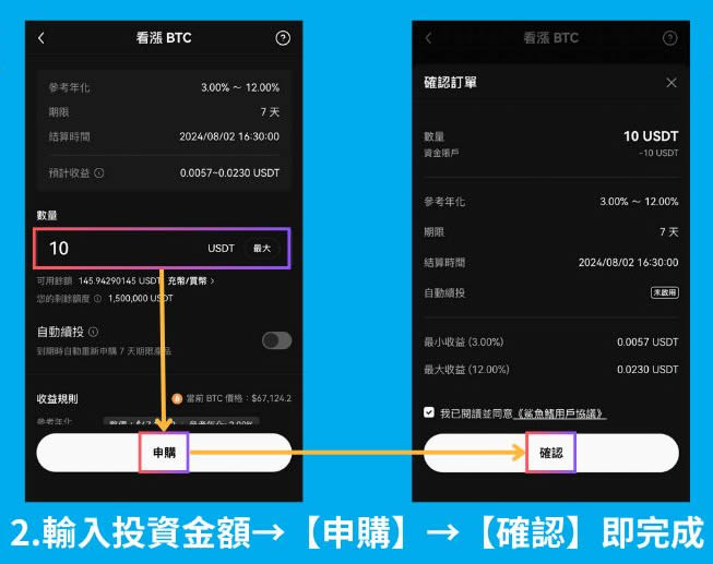 当btc 结算时价格> 71,300 或<65,900 时,获得15% usdt 收益。