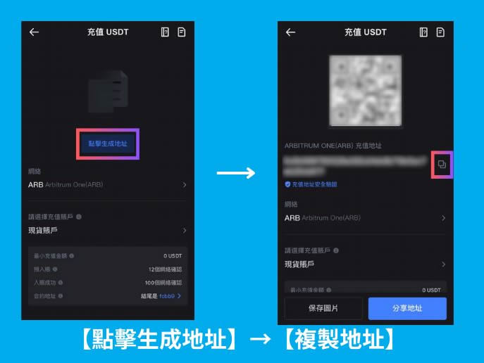 到mexc app 点【资产】→【充值】→选择入金币种、网路(要留意需要与max 交易所出金的币别、网路相同)→【点击生成地址】→【复制地址】