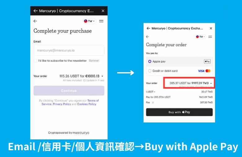 这边以mercuryo 平台为例,进入页面后需要完成email 、信用卡以及个人资讯的确认再次确认。最后,支付方式和数量都正确后,按下「buy with apple pay」即完成交易。购买的加密货币在5 ~ 10 分钟后就会出现在现货帐户中。