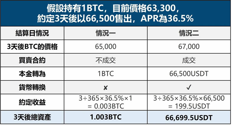 情况一的买卖合约不会成交,结算固定收益时会用持有的货币币别btc做计算,约定的收益用本金1btc乘上3天合约的apr36.5%,得到0.003btc的收益;