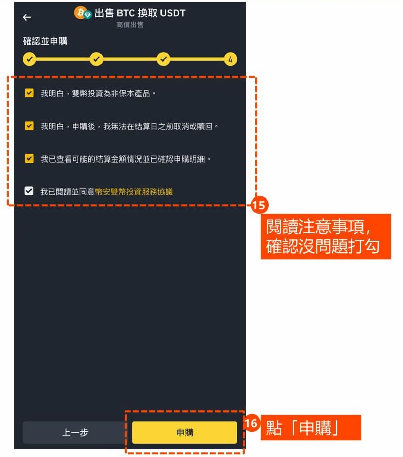 目前持有usdt想在未来低价买入btc,申购双币合约,确认约定的结算日、目标价、apr报酬。