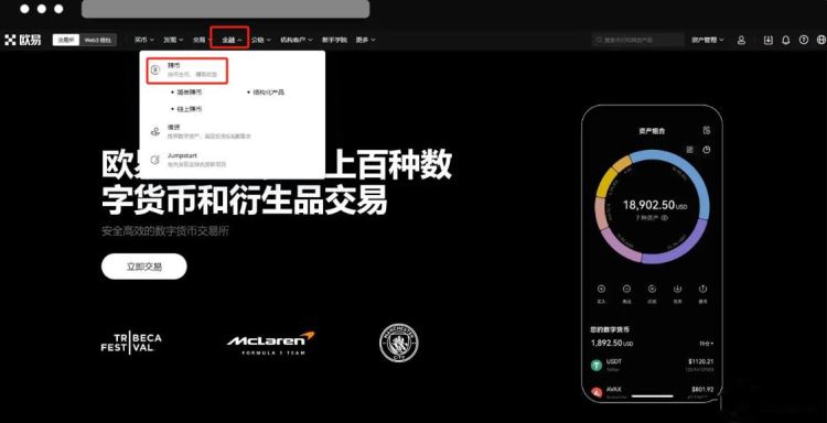 1、打开欧易交易所官网(点击注册),在首页点击【金融】—【赚币】