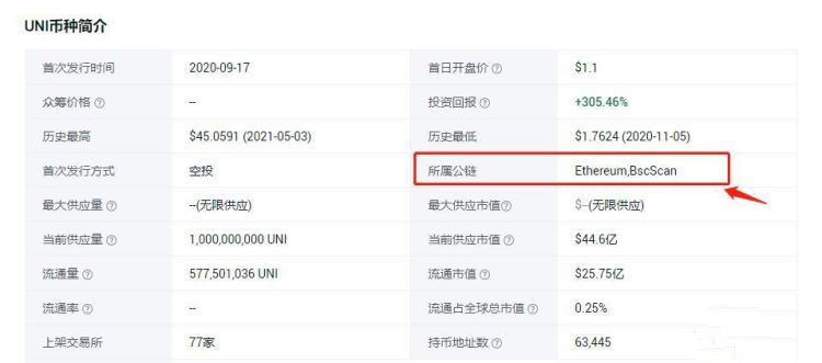 3. 如果不清楚该币种属于什么公链,可以根据币种简介的公链信息去辨别,像uni币所属公链是ethereum,bscscan,就可以同时通过这两个区块链浏览器去查询该币种的代币合约地址信息
