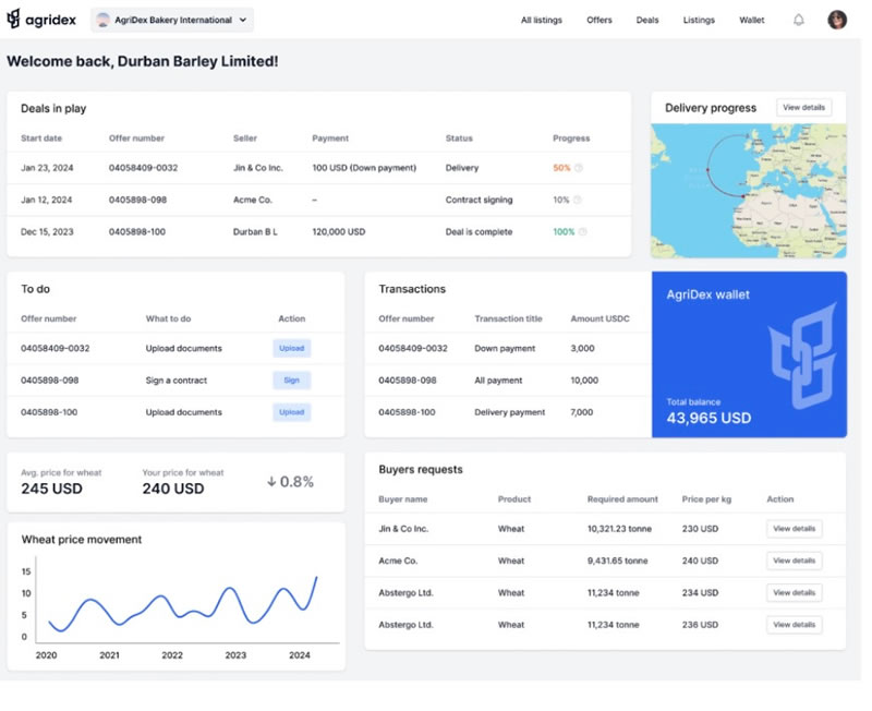agridex 的功能包括一个用于实时跟踪交易、付款、运输和缺失要求的仪表板,提供可操作的见解。买方和卖方可以自定义贸易条款,确保满足个体需求的灵活性。