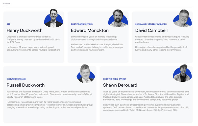 该团队拥有涵盖金融、农业、法律合规和技术的多元化专业知识。主要成员包括: