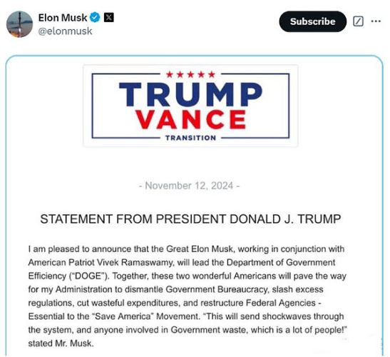埃隆·马斯克在 x 上分享的唐纳德·特朗普 doge 声明的摘录。