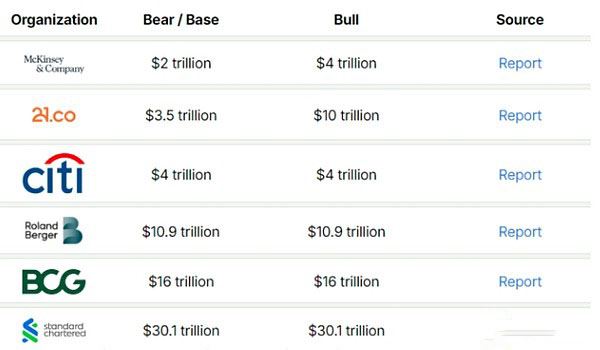 大多数公司预测 rwa 行业的市场规模可能达到 4 万亿美元至 30 万亿美元。