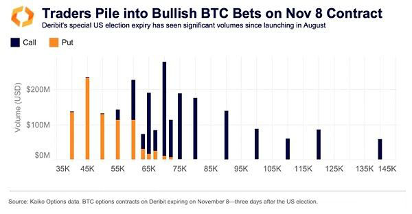 在 11 月 5 日大选之前,比特币出现市场参与者的“特 朗普交易行情”。 deribit 上的一份特别选举合约在选举前吸引了数十亿美元的交易量和未平仓合约,选举后不久押注于历史新高的交易者出现了重大看涨倾向。他们是对的,到 11 月 btc 交易量已超过 7.5 万美元。