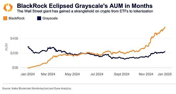 贝莱德是大赢家,表明主要机构对比特币和数字资产感兴趣。其现货 btc etf 管理的资产规模超过 550 亿美元,在几个月内就超过了 grayscale 的 gbtc。 gbtc 由数字资产管理公司 grayscale 于 2013 年推出,在很大程度上是一种加密货币优先产品,其资产净值的巨大溢价/折价意味着机构的买入有限。因此,今年 etf 推出后,它很快就被贝莱德 (blackrock) 超越。