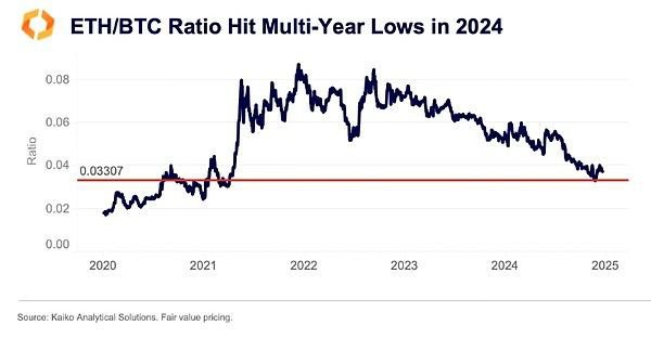 自合并以来,eth/btc 比率持续下降,并且在 2024 年没有显示出放缓的迹象。该比率比较了两种资产的表现,当以太坊表现逊于比特币时,该比率就会下降。