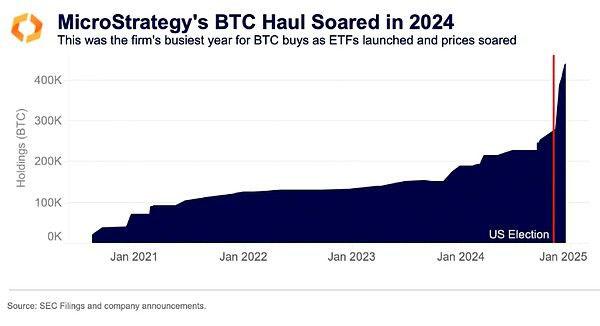 自1月份以来,microstrategy已经购买了超过249,850个比特币,自美国大选以来购买速度加快,过去一个月的持有量几乎翻了一番。该公司已经发行了多笔可转换债券,为其收购提供资金,这引发了一些市场参与者的担忧,即价格暴跌可能对该公司产生不利影响,甚至可能导致被迫抛售。
