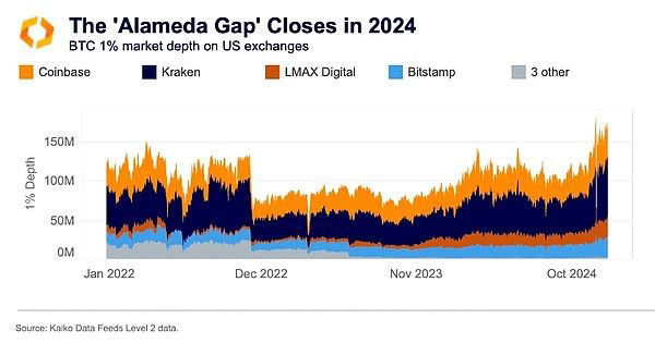 在价格上涨和市场份额不断增长的推动下,今年比特币 1% 的市场深度已高于 ftx 之前约 1.2 亿美元的水平。 kraken、coinbase 和 lmax digital 的复苏最为突出。值得注意的是,以机构为中心的 lmax 的比特币市场深度本周达到创纪录的 2700 万美元,短暂超过 bitstamp,成为第三大流动性比特币市场。