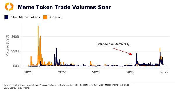 在稳定币和原生l1交易费用之后,telegram交易机器人在2024年成为最赚钱的领域,在协议净收入方面甚至超过了aave和makerdao(现在的sky)等主要的defi协议。这在很大程度上是交易和memecoin活动增加的结果。事实上,meme代币在2024年一直是表现最好的加密赛道(以总市值增长来衡量),meme代币的交易活动(在solana dexs)在整个24年第四季度都在飙升。