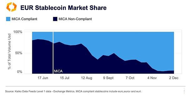 2024 年全年,欧元兑加密货币的交易量保持在去年平均水平以上,表明需求不断增长。 mica 颁布三个月后,在符合 mica 的替代品兴起的推动下,欧元支持的稳定币市场经历了重大转变。到 2024 年 11 月,符合 mica 的欧元稳定币(包括 circle 的 eurc、法国兴业银行的 eurcv 和 banking circle 的 euri)已占据创纪录的 91% 市场份额。