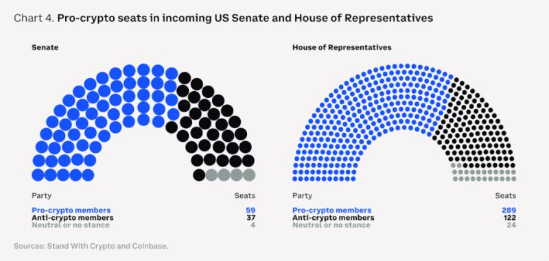 在与监管模糊性斗争多年后,美国下届立法会议可能会提升加密行业监管清晰度。这次选举向华 盛顿发出了一个强烈的信息,即公众对当前的金融体系不满,希望变革。从市场的角度来看,众议院和参议院两党都支持加密货币,这意味着美国的监管可能会在2025年从“逆风”转向“顺风”。