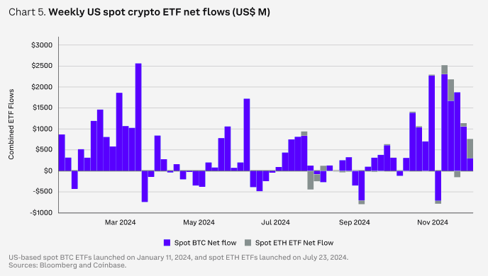 与此同时,美国在2024年就已奠定了更加清晰的监管基础,远早于11月的大选。这为2025年取得更大进步奠定了基础,有可能巩固数字资产在主流金融中的地位。