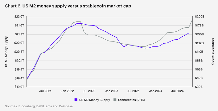 2024年,稳定币实现了大幅增长,总市值增长了48%,达到1930亿美元(截至12月1日)。一些市场分析师认为,根据目前的轨迹,该行业在未来五年内可以增长到近3万亿美元。虽然可能看起来很高,但考虑到这一估值与当今整个加密货币的规模相媲美,这一估值仅占美国m2总供应量21万亿美元的14%左右。