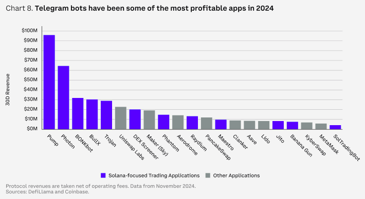 与大多数交易界面一样,telegram机器人从每笔交易中赚取一定比例的费用,最高可达交易金额的1%。然而,由于他们交易的标的资产的波动性,用户可能不会被高额费用所阻。截至12月1日,收入最高的机器人photon累计年初至今收费达到2.1亿美元,接近solana最大的memecoin发射器pump的2.27亿美元。其他主要机器人,如trojan和bonkbot,也分别获得了1.05亿美元和9900万美元的可观利润。相比之下,扣除费用后,aave在2024年全年的协议收入为 7400 万美元。